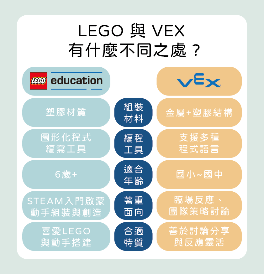 LEGO 系列趣味性高、組裝較容易上手,操作上更強調將機器調整至最佳的狀態。VEX 則是更進階的機器人平台,提供更多的工程挑戰,涵蓋更複雜的程式編寫和機械結構設計,並強調建構機器人的團隊合作與紀錄,可以很好的培養協作能力。