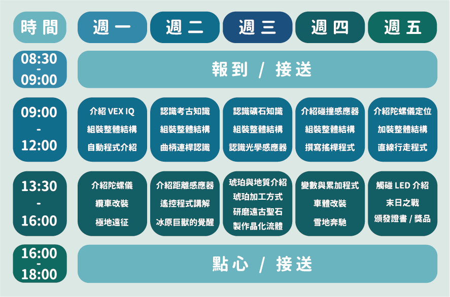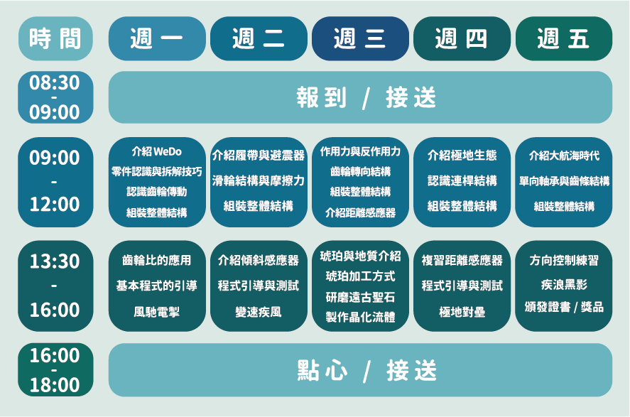 本次營隊安排都是全日營,以提供學員更連貫並完整的學習內容。